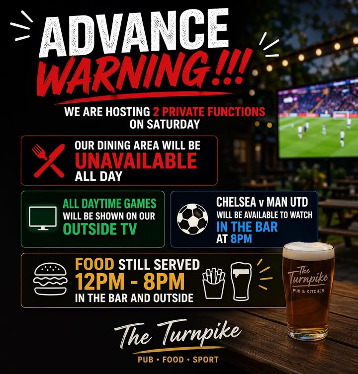 🚨 ADVANCE WARNING FOR SATURDAY 🚨 We’ve got a busy one coming up this weekend as we’re hosting TWO private functions 🎉 👉 This means our dining area will be unavailable all day BUT don’t worry… we’ve still got you covered 👇 ⚽ All daytime sport will be shown on our outside TV (perfect if the weather behaves 🙌) 🔥 8PM – Chelsea v Man Utd will be shown LIVE in the bar with full atmosphere 🍔 Food is still being served 12–8PM ➡️ Available in the bar & outside areas So whether you’re here for the football, the food, or just a few drinks… we’re still very much open and ready for you 🍻 Just a little heads up so you can plan ahead! #TheTurnpike #MatchDay #LiveFootball #PubVibes #WeekendPlans #Middlewich #FootballNight #BarLife #CommunityPub