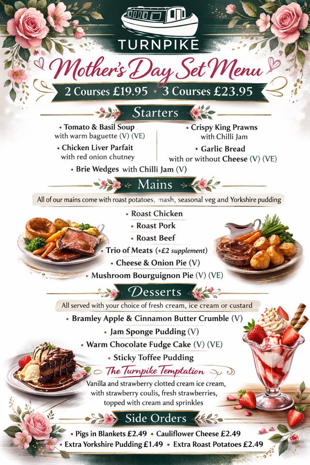 💐 Sunday 15th March – Mother’s Day at The Turnpike 💐 Mother’s Day is just around the corner and we’re getting ready to welcome lots of families for a special Sunday celebration. If you’re planning on joining us, make sure you get your table booked soon as our 2pm sitting is now almost full. We still have availability for the 4pm sitting, so there’s still time to secure your spot. Bring Mum down, enjoy a fantastic meal together and let us make her day extra special. 🌸 2 Courses – £19.95 🌸 3 Courses – £23.95 Bookings are essential, so message the page or pop in behind the bar to reserve your table. Let’s make Mother’s Day a busy and brilliant one at The Turnpike ❤️