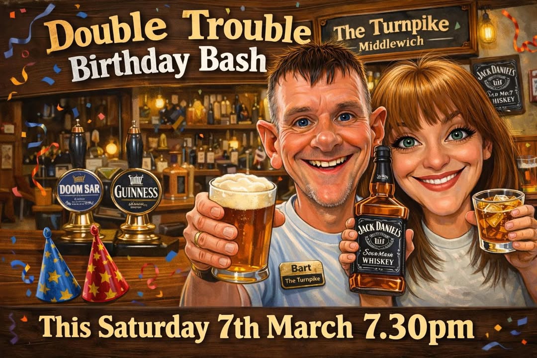 🎂🎉 DOUBLE TROUBLE THIS SATURDAY! 🎉🎂 It’s Bart & Krysty’s Birthday Bash this weekend and trust us… when these two celebrate, it’s never quiet 😆 We’re throwing a joint birthday party at The Turnpike and the best bit… everyone’s invited! 🔥 DJ line up packed with your favourites ⏰ Starting 7.30pm sharp 🍻 Great atmosphere guaranteed So come down, grab a drink, have a dance and help us give them a birthday party they won’t forget (or might not remember… depending on the shots 😂). #TheTurnpike #DoubleTrouble #BirthdayParty #TurnyNights #MiddlewichPub #PartyTime #GoodVibes